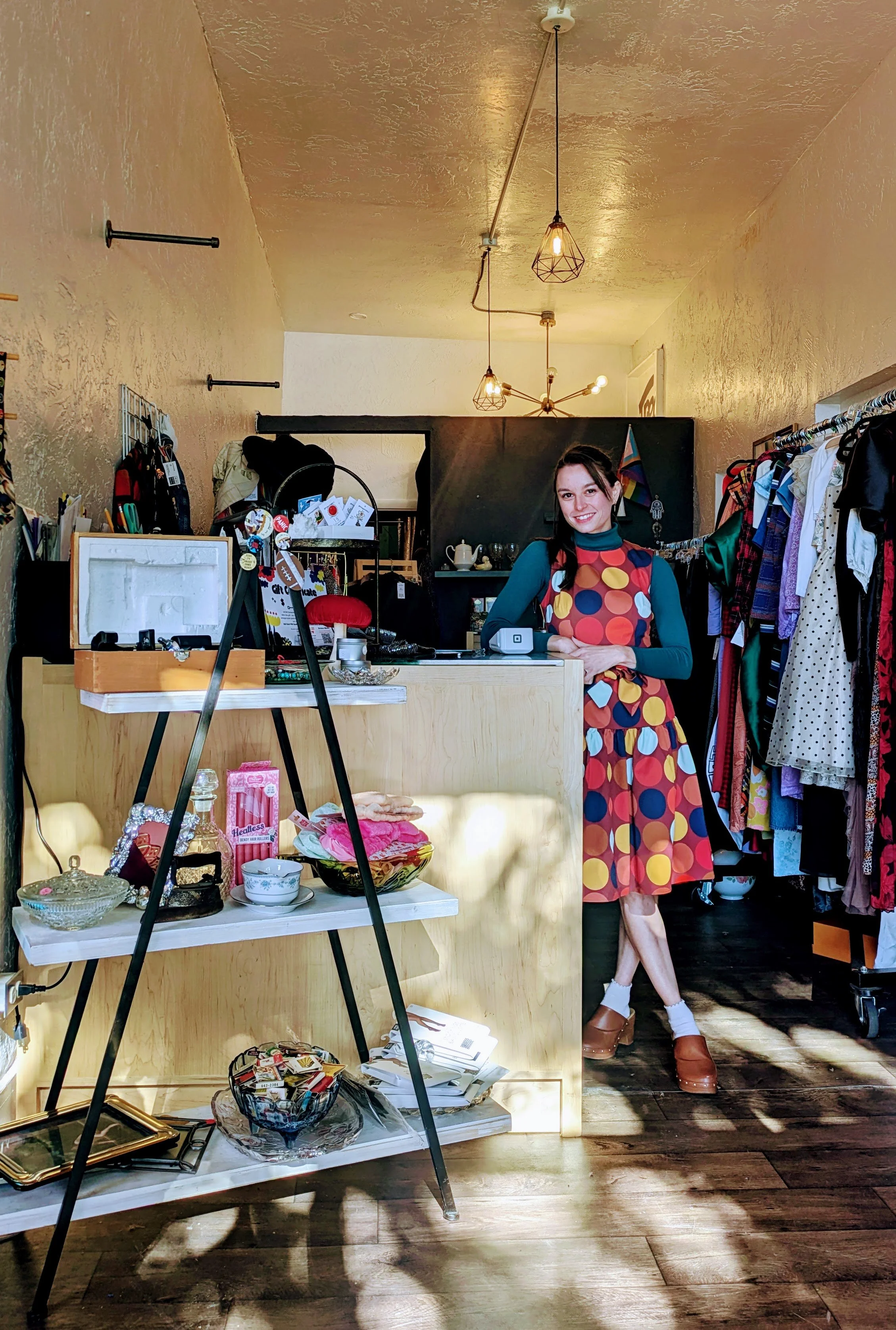 Person smiling in front of colorful mural with clothing racks in a store.